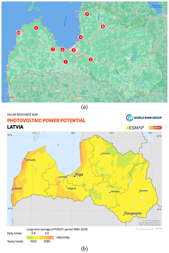 (a) Locations of selected facilities in Latvia. (b) Latvia’s PV power potential (PVOUT) (reprinted with permission from Ref. [30]. 2023, Global Solar Atlas).