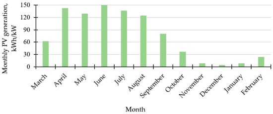 For ease of data interpretation and informed decision-making based on relative values, the specific value method was used. All ten facilities were reduced to a capacity of 1 kW. By employing the method of average values, the vector of the average monthly PV generation values was computed and is presented in Figure 3. This chart shows how seasonal PV output is in Latvia, which can result in differences in the SCRs obtained in this study and those calculated for a sunnier climate, e.g., in central or southern Europe. The data obtained will be further used for the SC model, which is considered in Section 2.3.