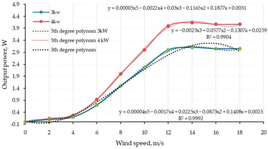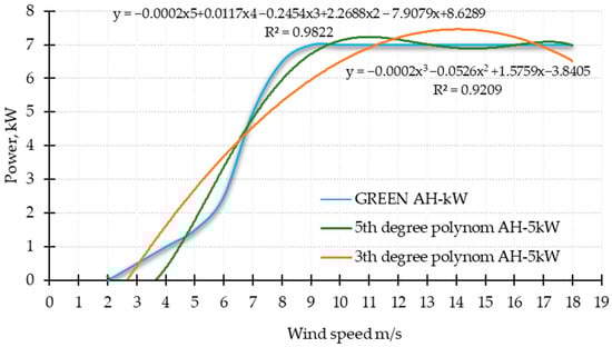 To calculate the potential amount of electricity that each of the four selected turbines could generate, data from the Riga meteorological station regarding the average wind speed for each hour in 2022 were used [38]. Using the technical data of the turbines—specifically, the approximation of power curves based on wind speed—an estimation was made on how much electricity each turbine could generate per hour in the year 2022. For the approximation of the output power curve, a 5th-degree polynomial was selected (Figure 4 and Figure 5). The choice of polynomial degree was determined by an algorithm aimed at representing the WT output power curve with the highest accuracy, allowing a maximum degree of 5. In spite of the fact that, in practice, the degree of the polynomial for WT output generation is rarely chosen to be greater than 3, we decided to use a 5th-degree polynomial.