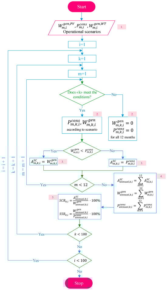 For each combination of active customers, the monthly energy consumption by the i-th and k-th active customer, and energy generation by the WT or the PV system for the i-th and k-th active customer, , are calculated (Block 2, Figure 6). If the consumption amount exceeds generation during a given month, the value of the monthly SC by the ECom of the i-th and k-th active customer, , is equal to ; and if not, then to (Block 3, Figure 6). The SC value is calculated for each month. After all 12 months of the net billing system period have been calculated, the annual SC, , energy generation, , and energy consumption, , by the ECom of the i-th and k-th active customer are estimated (Block 4, Figure 6). After that, the SC rate, , and the self-sufficiency rate, , for the ECom of the i-th and k-th active customer are defined (Block 5, Figure 6).