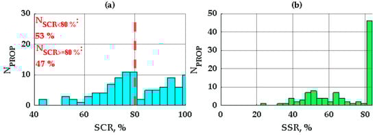 Histograms of: (a) SCRs with NSCR<80% and NSCR≥80% indicating the percentage of individual active customers that would not reach the 80% SCR requirement and ones that would reach it, and (b) SSRs for individual active customers with only PV panels installed.