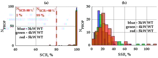 The SCRs shown in Figure 7a indicate that for individual, PV-powered active customers, the selected installed capacity (rated power) is relatively high compared to the demand because in more than half of the cases, the 80% SCR requirement for PV support is not met. This is also corroborated by the high SSRs in Figure 7b. As can be seen in the second histogram, most values are above 50%, with a large portion of load profiles reaching the 80–100% range. In contrast to SSRs, the SCR values are also less concentrated. When looking more into the details of these results, it can be seen that the rated power of PV installations is often close to the limits imposed by the support scheme. For comparison, the same metrics are presented in Figure 8 for individual active customers with only WTs installed.