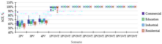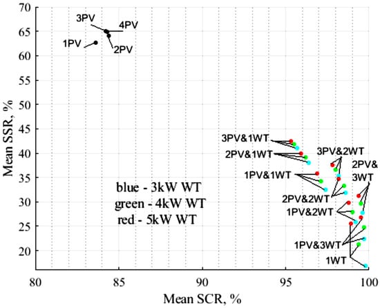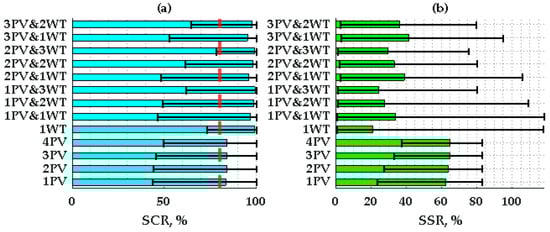 Next, renewable power use can also be evaluated for various scenarios of EComs. The SCRs and SSRs for all the scenarios of EComs considered are presented in Figure 9, where bars represent the mean values for all scenarios, including the results obtained using both methods for sizing PV installations and all three WT types considered; error bars (black segments) demonstrate the minimum and maximum values. Numbers adjacent to “PV” and “WT” refer to the number of active customers with the particular renewable sources installed constituting an ECom in each scenario, except for 1PV and 1WT, which represent individual active customers.