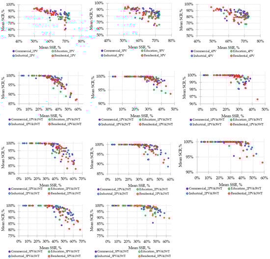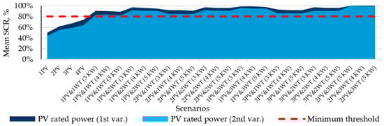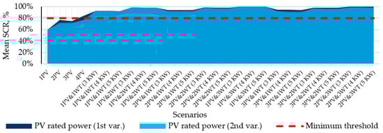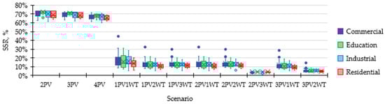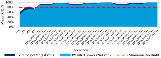 Furthermore, it can be observed that the higher the installed capacity of the WTs used, the higher the SSRs in Figure 8b, because the net rated power obtained is higher in this situation, even if the maximum number of turbines with a higher rated power is lower.