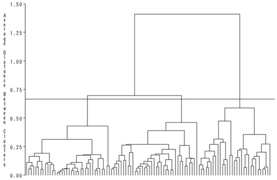 Although Equation (3) allows for the selection of 99 countries, the final sample consists of 105 countries, as those that did not have values for the variables were filtered out. This sample will be used for further analysis. The subsequent phase of the analysis was to identify a grouping of countries within the sample. To achieve this, a cluster analysis was conducted using SAS Enterprise Guide software (version 8.3, 2020, Cary, NC, USA), resulting in classification according to all variables. The clustering algorithm chosen was Average Simple Linkage, which consists of evaluating the distance between two classes starting from their centers of gravity and then determining the number of classes.