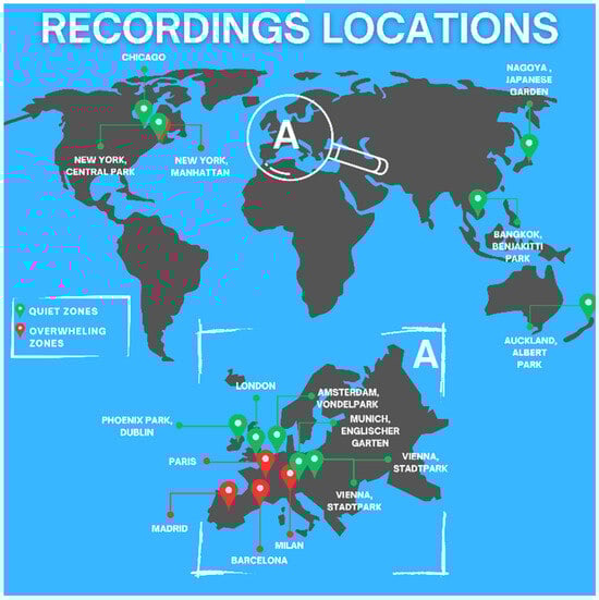 The discussed analysis is not focused on individual acoustic events but on the affective perception by human senses of the total soundscape of a specific place [39]. This is why most of the commonly accessible databases do not provide significant information for designing Care Space. When we have to do with projects of revitalizing of urban space, while designing the soundscape it seems necessary to search for the existing spots that satisfy the definition of a Care Space. We watched thousands of videos featuring strolls within cities. We were searching for peaceful urban spaces and overwhelming ones. The labels were verified to decide whether the acoustic events occurring in the videos could take place in the space we designed. Therefore, a database consisting of generally available recordings, which were downloaded from YouTube and are licensed under Creative Commons Attribution (CC BY), documenting soundscapes of various urban areas from all over the world (Figure 1), was developed in the Google Collaboratory environment. When the set of videos reached the size that allowed us to teach the network, we terminated our search.