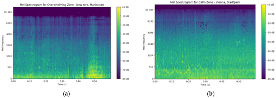 Mel-spectrograms for the overwhelming space—Manhattan, New York (a) and for the quiet space—Stadtpark in Vienna (b).