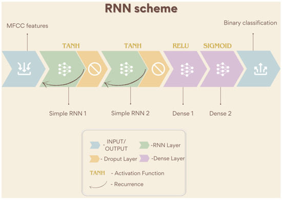 After collecting and classifying the data from various places all over the world, the next step involved designing and implementing a neural network model capable of effectively analyzing urban soundscapes. The architecture (Figure 3) chosen was based on recurrent neural networks (RNN) [46,47], which in this case are used to process dynamic, time-varying sequential data such as sounds [48]. The RNN model consists of two stacked SimpleRNN layers, each containing 50 neurons, followed by ReLU activation functions to introduce non-linearity and capture complex patterns in the data. The RNN model was designed so that the information included in MFCC features could be used in full. The input data were reshaped to match the RNN input format allowing the network to process sequences of MFCC features effectively. To mitigate the risk of overfitting, dropout layers with a rate of 0.2 were added after each SimpleRNN layer. These layers randomly exclude a certain proportion of neurons during the training, which forces the network to learn more general patterns in the data instead of relying on specific, potentially random training features. The network uses recurrence, meaning that each recurrent unit processes the input data while also taking into account information from previous time-steps. This design allows the model to capture temporal and contextual dependencies present in urban soundscapes.