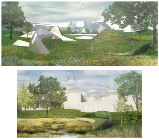 During the “New Space” workshops [15], different conceptions of Care Space were developed. These projects included places favorable for reviving social relationships, supporting mutual care and cooperation, or focused on security and coziness as well as promoting psychological and physical wellbeing through contact with nature. They were a response to the current needs of the area, its users and residents, and to the modern challenges connected with climate changes, post-pandemic health problems, and social tensions issuing from conflicts and mass migration. Care was executed in them through appropriate (organic) shapes of the designed objects and elements, the use of natural materials and colors, planting of vegetation, and the application of noise-masking technologies and air-purifying filters. The spaces were designed so that they could also use the therapeutic potential of the existing hospital complex by creating a refuge from excessive traffic noise. The projects discussed are presented below.
