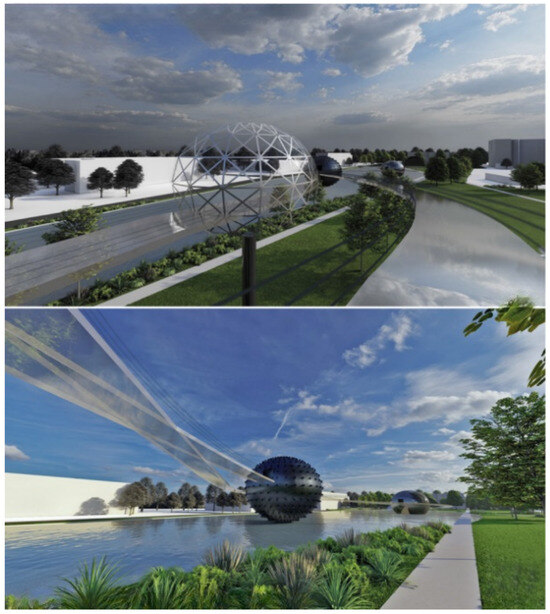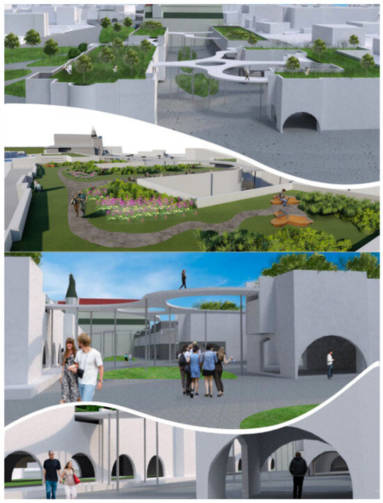 Designing a soundscape will be discussed on the basis of the Green Empiria project. This project involves the development of a Care Space facilitating mental recovery, that is, a sphere in which persons who are not members of a given community would feel invited and could move freely within it. Based on the executed measurements, the space arrangement was designed so that its conditions could be put to the best use. At the spot where the registered level of noise was the lowest, a space for meditation called the Enclave of Silence was created. At this spot, the traffic noise is hardly audible, but to protect the enclave better from undesirable noise, wooden sound-absorbing panels were installed. The project also includes bicycle lanes and a preventive healthcare center that would promote health screenings. For example, a coffee shop in this area could offer special discounts like ‘Coffee for health check-ups’, thus supporting preventive healthcare. The Enclave of Silence is a place for calming down and meditation, equipped with sound-absorbing materials. On the other hand, an information center equipped with interactive boards and models would provide information about the whole area and the forms of mental recovery. Additionally, in the sensory reset garden, one could find special therapeutic booths that would ensure full sensory regeneration. The area also provides horticultural therapy zones, art therapy spheres, and aromatherapy spots, which offer diverse forms of therapy through contact with nature, art, and fragrances. The design was visualized in detail in Figure 11.