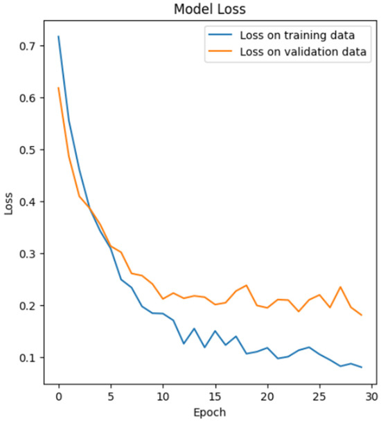 The training data were split into 80% for training and 20% for testing using stratified sampling to maintain class balance. The model was trained using binary cross entropy as the loss function, and the Adam optimizer with a learning rate of 0.001 was chosen for its efficiency in updating the weights. The training process involved 30 epochs with a batch size of 64, during which both loss and accuracy metrics were monitored on training and validation sets. This approach enabled continuous evaluation of model performance and early detection of potential overfitting. The final Dense layer contains 50 neurons with a ReLU activation function, followed by an output layer using a sigmoid activation function for binary classification (quiet vs. overwhelming).