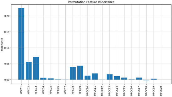 In the next stage of the study, Permutation Feature Importance was executed using the Sklearn library [52]. This technique is used to assess which input variables exert the greatest influence on the predictions of the model. In the context of the discussed RNN model, the application of this technique helps to understand which MFCC coefficients are the most important for the differentiation between quiet spaces and overwhelming ones. At the beginning, the basic precision of the model was calculated on the test data. This result serves as a reference point for comparing the results after feature permutation. Precision is measured using accuracy metrics, which evaluate the conformity of the model predictions with actual labels. Then, each feature is individually permuted. To this end, the values of a given feature are randomly reshuffled, which allows breaking its connection with the remaining features and labels. The model is reevaluated on the altered data, and the obtained precision is recorded. This process is repeated several times, in this case ten times for each feature, to obtain stable results. The difference between the basic precision and the mean precision obtained after the permutation of a given feature is the measure of its importance. The greater the difference, the stronger the influence of a given feature on the model’s efficiency.