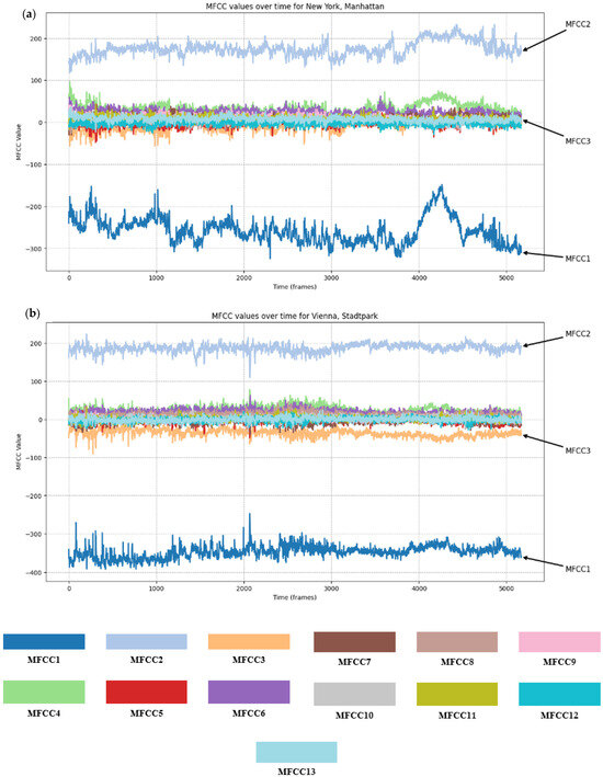 To understand how sound features differ depending on the environments under consideration, it is necessary to create diagrams showing the variability of MFCC features over time, which allow for the visualization of their dynamics. For instance, in overwhelming spaces, we expect to see greater changes in MFCC1 values, reflecting increased sound intensity connected with traffic congestion. In contrast, in quiet spaces, MFCC1 values will be low and more stable, suggesting a less intense sound background. This phenomenon is evident in the diagrams of MFCC feature variability over time, as shown in Figure 16 for an overwhelming space—Manhattan, New York (a) and a quiet space in Stadtpark, Vienna (b).