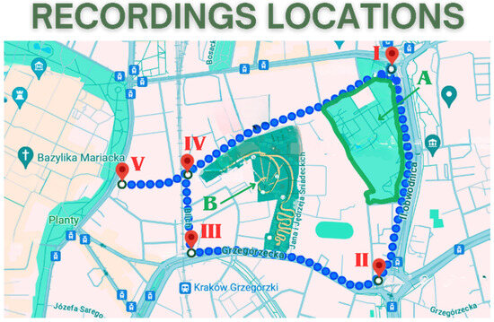 Evaluation In order to verify the applied algorithm, a field study was conducted in the area of Wesola in Krakow. The study was aimed at analyzing the urban soundscape with the help of the previously trained RNN model. The study focused on identifying and classifying different types of urban environments based on their sound profiles recorded by two voice recording applications on Xiaomi Mi 10 (Xiaomi Corp., Beijing, China) and Sony Xperia XA2 Ultra (Sony Corporation, Tokyo, Japan) smartphones. The devices were selected to check independent results as well as compare and ensure repeatability of sound classification in different conditions [54]. Xiaomi used the system application “Dictaphone” (version 5.0.23.8) while Xperia used the Dictaphone application provided by Splend Apps (version 3.29). This approach allowed the researchers to analyze whether different sources of sound recording influence the results of classification. Using commonly accessible equipment instead of specialized measuring apparatus made it possible to check how an average user might experience the soundscape in different urban areas [55]. The measurements were conducted by a person walking along designated routes in the Wesola quarter of Krakow. They started at the Botanical Garden (marked by letter A), continuing to the Warsaw Uprising Avenue (Aleja Powstania Warszawskiego) (I), moving along Grzegorzecka Street (II), Blich Street (III), and Kopernika Street (IV), later turning towards the Market Square (V) and then in the direction of Mogilskie Roundabout (I). Each recording lasted one minute, which corresponds with the structure of the data used in the training of the neural network. The choice of this methodology allows for a direct comparison with the original training data, which were used to calibrate the model analyzing the urban soundscape. The map showing the routes where recordings were conducted as well as the aforementioned characteristic spots is shown in Figure 17. The letter B marks the conceptual visualization of the Green Empiria project placed on the map of the Wesola district.