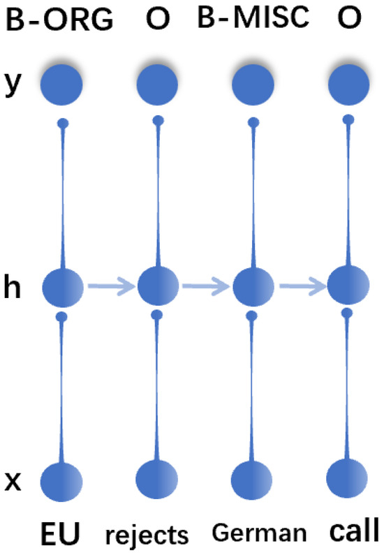 The following diagram (Figure 2) depicts the structure of an RNN, consisting of input layer x, hidden layer h, and output layer y. In the named entity recognition task, x is the input text, and y is the output label. The model tags each word in the input text. Named Entity Recognition commonly uses BIO tagging and BIOES tagging. Among them, B—begin indicates the beginning, I—inside indicates inside, O—outside indicates non-entity, E—end indicates the end of the entity, and S—single indicates the word itself is an entity. The text uses BIO tagging, where EU represents organizational entities, rejects are non-entities, German represents miscellaneous entities, and the call is a non-entity. This model needs to undergo some processing when inputting textual data, such as extracting word vectors, one-hot variables, or other statistical features, to be used as input x, and the output y is the probability of each category corresponding to the word. Each word is generally referred to as a time point t.