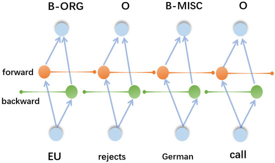 Long Short-Term Memory (LSTM) networks and Bidirectional Long Short-Term Memory (Bi-LSTM) networks are extensions of the primary Recurrent Neural Network (RNN) architecture aimed at addressing the vanishing gradient problem and capturing long-term dependencies in sequential data. They are commonly used in deep learning to process sequential data. LSTM introduces gate mechanisms, enabling better capture of long-term dependencies and making it suitable for tasks requiring memorization of long sequences. Bi-LSTM, on the other hand, processes input sequences in both forward and backward directions, effectively capturing bidirectional contextual information in the sequential data, further enhancing the model’s performance. These models can improve performance in sequence labeling, machine translation, and sentiment analysis tasks. Bi-LSTM stands for Bidirectional Long Short-Term Memory [34]. It simultaneously considers the influence of both preceding and following contexts on annotation (Figure 3).