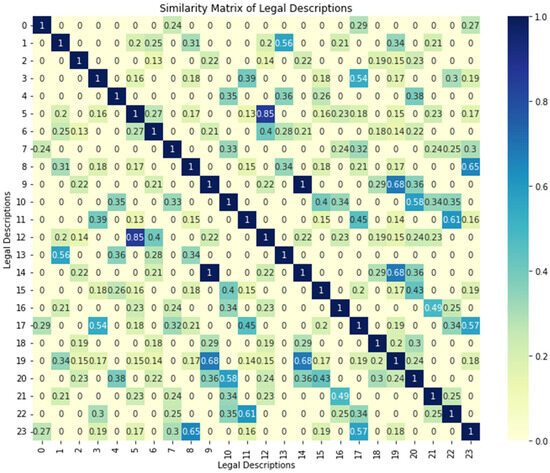 As shown in Figure 4, the x and y coordinates from 0 to 23 represent the index positions of all selected legal descriptions, corresponding to different clauses in different categories of legal descriptions for each country. Positions 0 to 5 correspond to various categories of legal descriptions for China, including mineral resources, land management, and environmental protection. Positions 6 to 13 correspond to different legal descriptions for the United States, covering mineral resource development, environmental protection, and land management. Positions 14 to 19 correspond to different legal descriptions for Canada, including mineral resource management, environmental protection, and land use planning. Positions 19 to 23 correspond to different legal descriptions for Chile involving mineral resource management, environmental protection, and land use policies. Table 4 displays the index positions of selected legal descriptions and their categories.