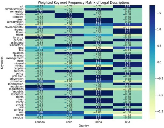 A heatmap was generated from the weighted keyword frequency matrix, with the horizontal axis representing four countries and the vertical axis representing keywords. The value in each cell indicates the weighted frequency of the corresponding keyword in legal texts from different countries. By extracting keywords from legal documents of China, the United States, Canada, and Chile, a weighted keyword frequency heatmap (Figure 5) could be generated.