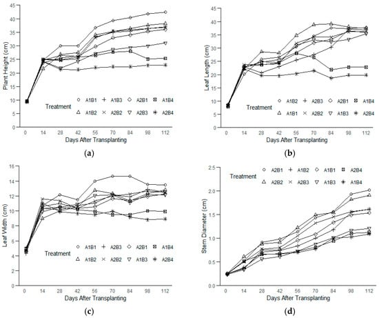 3.1. Plant Growth Parameters (Plant Height, Leaf Length, Leaf Width, and Stem Diameter)