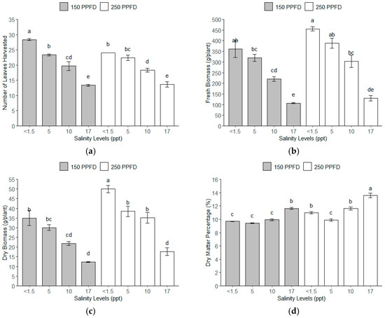 The yield parameters of kale gathered throughout a 112-day experiment under treatment combinations of light intensities (150 and 250 PPFDs) and salinity levels (<1.5, 5, 10, and 17 ppt, equivalent to <26, 86, 171, and 291 mM) with three replications each: (a) number of leaves harvested; (b) fresh biomass; (c) dry biomass; and (d) dry matter percentage. Error bars represent standard errors. Means with the same superscript letters on each plot were not significantly different at p < 0.05 using Tukey’s HSD test.