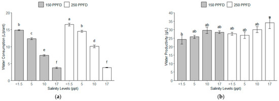 The water consumption and water productivity of kale plants under different light intensities (150 and 250 PPFDs) and salinity levels (<1.5, 5, 10, and 17 ppt, equivalent to <26, 86, 171, and 291 mM): (a) total water consumption per plant after 112 DAT (L/plant); (b) water productivity (g/L). Error bars represent standard errors. Means with the same superscript letters on each plot are not significantly different at p < 0.05 using Tukey’s HSD test.