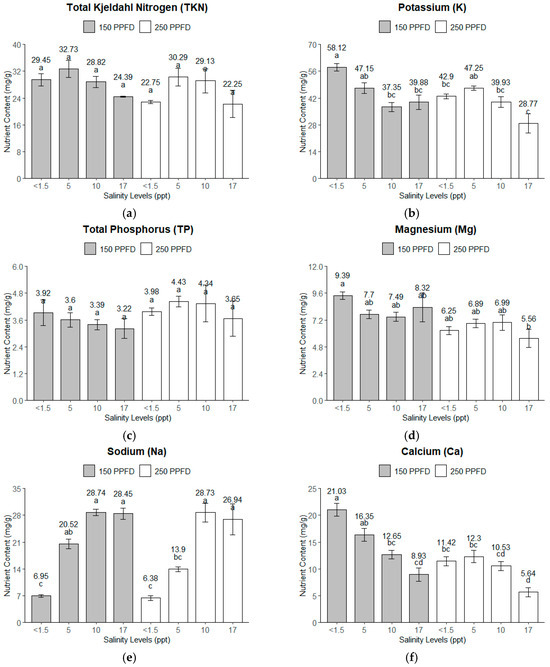 The macronutrient contents of kale leaves under different light intensities (150 and 250 PPFDs) and salinity levels (<1.5, 5, 10, and 17 ppt, equivalent to <26, 86, 171, and 291 mM): (a) total Kjeldahl nitrogen (TKN); (b) potassium; (c) total phosphorus (TP); (d) magnesium (Mg); (e) sodium (Na); (f) calcium (Ca). Error bars represent standard errors. Means with the same superscript letters on each plot were not significantly different at p < 0.05 using Tukey’s HSD test.