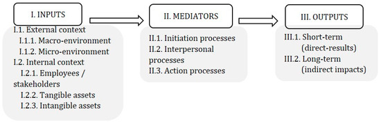 During the literature review, we analyzed abstracts of articles through the prism of the IMO model (“inputs–mediators–outputs”) to identify elements that suit that model with an aim to approach knowledge practically. “Inputs” are everything that constitutes the base of decision-making regarding organizational activities. As a result of completing tasks, results are achieved (“outputs”). Between inputs and outputs are “mediators”, relations (processes) that link the causes with effects, interactions (processes), or transient products of interactions (emergent states) that translate inputs into ‘outputs’ [83].