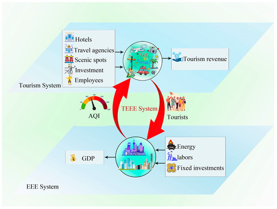 Tourism has become a critical pillar in global socioeconomic development, contributing significantly to economic growth, cultural exchanges, and employment [1]. However, the challenges posed by its resource consumption and environmental impact have increasingly come to the forefront in global sustainability discussions. As regional integration advances, the interplay between tourism and energy–economy–environment (EEE) systems has emerged as a pivotal issue for ensuring sustainable development. On one hand, as a significant component of the tertiary sector, the tourism industry promotes regional economic development. However, it also has adverse impacts on energy use and the environment. For example, tourist arrivals increase the consumption of regional resources, leading to increased carbon emissions [2]. Regional EEE systems support and safeguard the development of the tourism industry. For example, regions rich in energy resources may expand their tourism industry, whereas areas with beautiful ecological environments and economic prosperity can attract more tourists. These scenarios indicate that the level of interdependence between tourism and EEE systems will gradually increase with regional integration [3]. Additionally, the development of the tourism industry is sensitive to unforeseen public events. For example, the sudden outbreak of the 2020 COVID-19 pandemic has had a profound impact on the global tourism sector, resulting in a 72% reduction in tourism [4]. Hence, the coordinated development of regional tourism and EEE systems is crucial to enhance the resilience of the regional tourism industry and promote sustainable regional development.