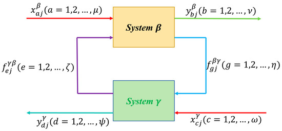 Let us assume there are two systems, namely and . represents the -th input of the -th DMU in the system. represents the -th output of the -th DMU in the system. represents the -th input of the -th DMU in the system. represents the -th output of the -th DMU in the system. represents the -th intermediary product from the system to the system for the -th DMU. represents the -th intermediary product from the system to the system for the -th DMU.