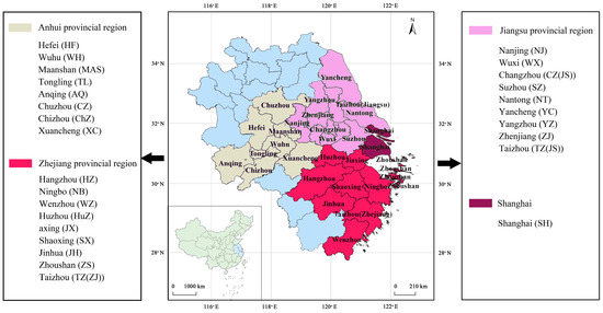 The YRDUA in China comprises 27 cities, including nine in Jiangsu Province, nine in Zhejiang Province, eight in Anhui Province, and one in Shanghai. Specifically, the geographical location of the Jiangsu Province region is in the northern part of the YRDUA, whereas the Zhejiang Province region is situated in the southern part. The Anhui Province region is located in the western part of the urban agglomeration, whereas Shanghai is in the eastern part. For a clearer representation of the geographical distribution of the YRDUA, refer to the geographical location map in Figure 3.