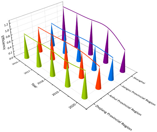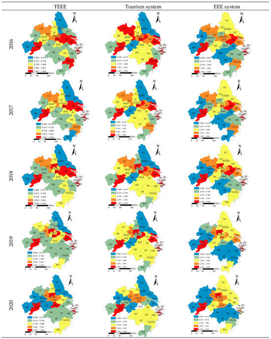 According to the regional analysis, from 2016 to 2020, the efficiency of the TEEE system in the Anhui Provincial Region, Jiangsu Provincial Region, and Shanghai decreased to a certain extent (Figure 5). The most significant decline occurred in 2020, mainly due to the COVID-19 pandemic. Taking the Anhui Provincial Region as an example, the TEEE system efficiency in this region was 0.9 in 2016; however, by 2020, this value had dropped to 0.72, representing a significant decrease of 20.55%. By contrast, the TEEE system efficiency in the Zhejiang Provincial Region was hardly affected by the COVID-19 pandemic, with efficiencies of 0.87 in both 2016 and 2020. This indicates that the region’s resource allocation in the TEEE system is scientifically sound, making it more resilient and capable of withstanding the impact of major unforeseen events. In terms of efficiency, the tourism systems are ranked as follows: Shanghai, Zhejiang Provincial Region, Anhui Provincial Region, and Jiangsu Provincial Region. This is similar to the findings of Hu et al. (2023) [46]. Specifically, Shanghai had the highest efficiency value at 1.38, whereas the efficiency value for Jiangsu Provincial Region was only 0.72. Taking Jiangsu Provincial Region as an example, cities like NJ, WX, SZ, CZ(JS), YZ, and ZJ have tourism system efficiency values exceeding 0.85. In contrast, NT, YC, and TZ(JS) have an average tourism system efficiency of only 0.32. This reveals significant differences in tourism system efficiency among cities in the Jiangsu Provincial Region, demonstrating a clear imbalance in tourism development. The efficiency ranking for the EEE system was as follows: Shanghai > Jiangsu Provincial Region > Anhui Provincial Region > Zhejiang Provincial Region. Specifically, from 2016 to 2020, the efficiency of Shanghai and the Jiangsu Provincial Region remained relatively stable, whereas that of the Anhui and Zhejiang Provincial Regions exhibited a significant declining trend. In the case of the Anhui Provincial Region, the EEE system efficiency value in 2020 decreased by 11.4% compared to that in 2016. This suggests that there is potential for enhancement in the allocation of energy and environmental resources in Anhui Province. Future efforts should focus on optimising the industrial structure, reducing environmental pollution, and enhancing the overall energy–economic–environmental efficiency.