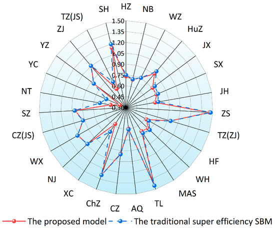 To validate the superiority of the proposed SE-NSBM model, we compare it with the traditional SESBM model, which does not consider the interaction between tourism and EEE systems (Figure 6). When the interaction between tourism and EEE systems was not considered, the EEE system is treated as independent. Therefore, the efficiency of the TEEE system is usually the weighted sum of the efficiencies of the tourism and EEE systems, with both systems assigned a weight coefficient of 0.5. By solving Model (1), the efficiency values for each subsystem can be obtained, which are then weighted and summed to obtain the efficiency value of the TEEE system. The results showed that without considering the interaction, the average efficiency of the TEEE system was 0.89. Considering this interaction, the average efficiency of the TEEE system was 0.86. This indicates that, without considering the interaction, the efficiency of the TEEE system was overestimated. The main reason for this is that considering the interaction introduces additional constraints, resulting in a smaller feasible solution space for the interactive model compared to the traditional model [14]. Specifically, without considering the interaction, the TEEE system efficiency of the 27 cities in the YRDUA was overestimated. The top three cities with overestimated TEEE system efficiency were YC, Nantong, and XC, which were overestimated by 0.2, 0.15, and 0.13, respectively. Furthermore, we calculated the standard deviation for both samples, and the results showed that the standard deviation of the TEEE system efficiency under the interaction scenario was 0.26, whereas that without considering the interaction was 0.24. Therefore, the model proposed in this study provides distinct differences in DMU efficiency and offers policymakers more decision-making information. While the SE-NSBM model does not impose strict requirements on the volume or characteristics of input data, including assumptions about statistical distributions or multicollinearity, it does account for errors that may arise during the calculation process [47]. The model incorporates slack variables to identify and correct inefficiencies, implicitly reflecting errors in input or output data. These slack variables help quantify discrepancies between observed and optimal efficiency, ensuring that the model can handle data inaccuracies without significantly affecting the overall results. In summary, compared with the traditional SESBM model, the model proposed in this study is more aligned with the actual scenario, providing decision-makers with a stronger decision-making basis and improving decision accuracy.