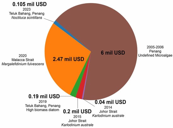 Fish kills resulting from harmful algal blooms (HABs) have substantial socio-economic impacts, as fisheries and aquaculture industries are important sectors in many coastal countries of Southeast Asia [83]. This issue has been a recurring problem since the 1970s, leading to significant economic losses in many countries. For example, the estimated financial impact on fish farmers in Malaysia has reached approximately USD 9 million [21,40,43,84,85] (Figure 2). Not all fish-kill reports quantify losses in monetary terms; some only describe the extent of biomass loss. A notable incident in 2016 at the Udang River in Penang reported 20–50% of caged fish died due to an unidentified microalgal bloom [86]. Additionally, smaller-scale wild fish-kill events from 2016 to 2019 in the Johor Strait were difficult to quantify in terms of tons and monetary value [87]. These cases pose a challenge to accurately assessing the economic impact of microalgal-related fish-kill incidents. The economic impact should ideally be determined through a counterfactual analysis, comparing outcomes to those if HAB events had not occurred, including mitigation and clean-up costs [88,89].