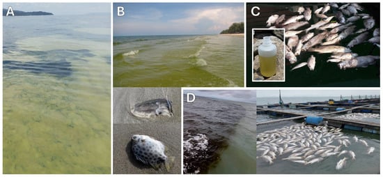 Discoloration and massive fish mortality events along the coasts of Malaysia in recent years caused by the blooms of Noctiluca scintillans (A), Chattonella malayana (B), Karlodinium australe (C), and Margalefidinium fulvescens (D).