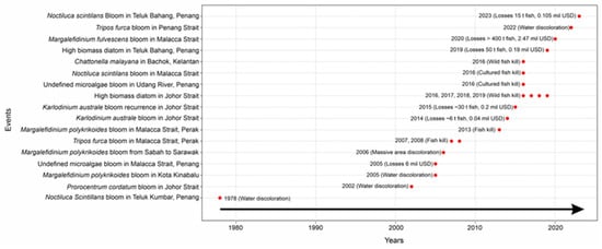 Chronology of fish-kill events in Malaysian waters (2000–2023) related to harmful algal blooms, with associated economic losses. Each red circle signifies a specific incident, marked with the year; each recorded event is cited in the text.