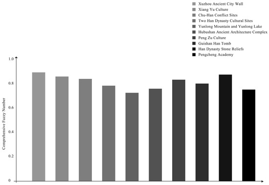 Therefore, the comprehensive score of the Xuzhou Ancient City Wall in the “Visual Appeal” dimension is 85 points. Similarly, the final scores of the 10 cultural symbols in the 5 evaluation dimensions are calculated, as shown in Table 3.