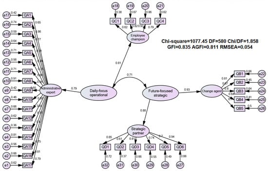 Ulrich (1996) categorizes the four HR dimensions into two major groups: (1) Future-focused/strategic, and (2) Daily-focused/operational. The roles of strategic partner and change agent fall under the future-focused/strategic category, while administrative expert and employee champion are classified as daily-focused/operational. Based on the correlation coefficients derived from the factor analysis, along with theoretical analysis, we similarly divided the four factors into these two categories. To further validate this structure, a second-order factor analysis was performed using AMOS 24.0. The results—Chi-Square = 1077.45, df = 580, Chi-Square/df = 1.858, p-value = 0.000, RMSEA = 0.054—demonstrate that the model established in this study is rational and well-supported, as shown in Figure 3.