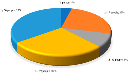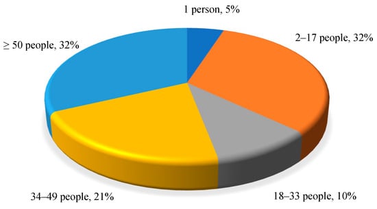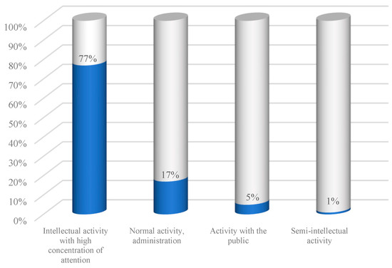 The most representative information for the current study is summarized in Figure 1, Figure 2, Figure 3, Figure 4, Figure 5, Figure 6 and Figure 7. According to Figure 1, it was found that 77% perform intellectual activities with a high level of concentration of attention, 17% carry out administrative activities and only 6% perform public and semi-intellectual activities. The evaluation of the office characteristics showed that over 32% of the respondents work in offices with a capacity of more than 50 people, 21% in offices with a capacity between 34–49 people, 10% in offices with 18–33 people, 32% in offices dedicated to 2–17 people and 5% in single offices (Figure 2).