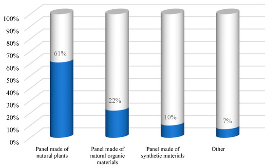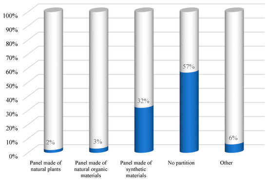 Following the users’ preferences, Figure 3, 61% of the respondents would choose green plant panels, 22% natural-organic panels, 10% synthetic panels, and 7% other types of panels. Analyzing the existence of dividing panels, it was observed that 57% indicated their absence, 32% reported the utilization of synthetic panels, and 11% chosen vegetable, natural organic, or other types of panels, Figure 4.