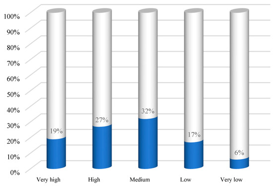 In the evaluation of the acoustic comfort at the workplace, influenced by internal (specific activities and equipment) and external noise sources (traffic and noise from neighboring buildings), 19% of the employees consider that the noise level felt is very high, 27% high, 32% medium and only 23% consider that the noise level is low and very low, Figure 5. Also, the noise level is perceived by 35% of the employees, on the medium-very high range, in offices with a capacity of more than 50 people, followed by 27% in offices with a capacity of 34–49 people, 9% in offices with a capacity between 18–33 people, and 25% in offices with a capacity of 2–17 people. The fact that noise is also felt in individual offices at a percentage of 4% is interesting (Figure 6).