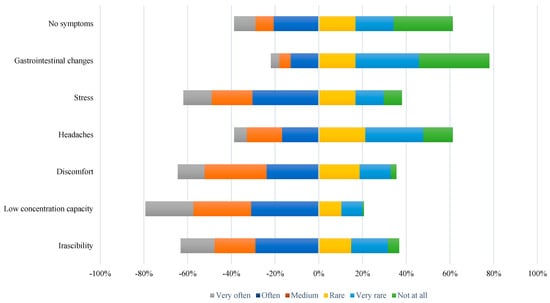 The symptoms experienced by the employees due to the noise existing in the working space are presented in Figure 7. Thus, 22% of the respondents pointed out that they very often suffer from a low ability to concentrate, 15% from irascibility, 13% from stress, 12% from discomfort, 6% from headaches, and 4% from gastrointestinal problems.