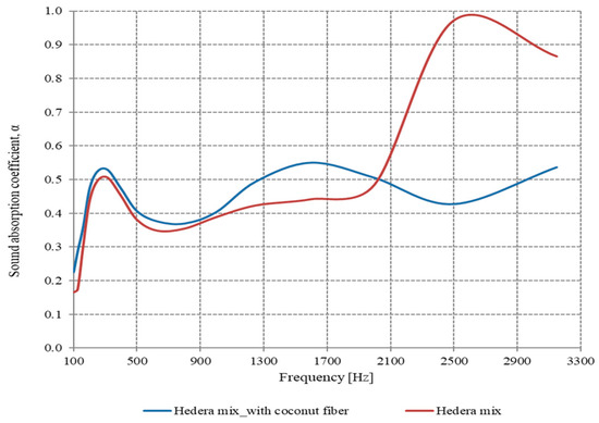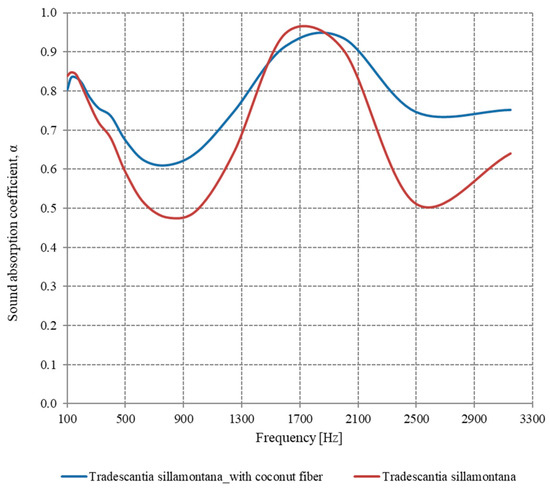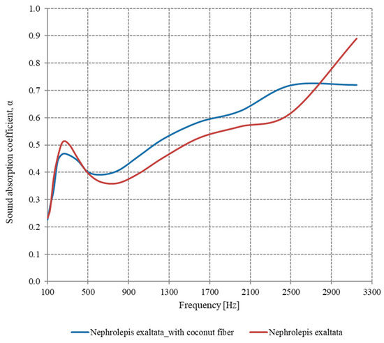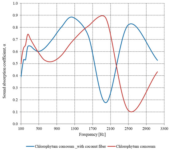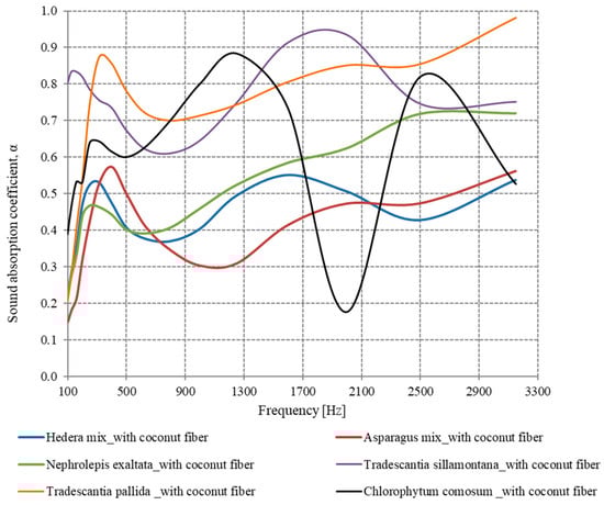 For the Nephrolepis plant, it can be seen (Figure 10) that the sound-absorbing properties are increased when using the coconut fiber layer, especially in the frequency range 420–2800 Hz. At frequencies higher than 2800 Hz, the sample without the coconut fiber layer has better sound absorption properties than the one with the coconut fiber layer.