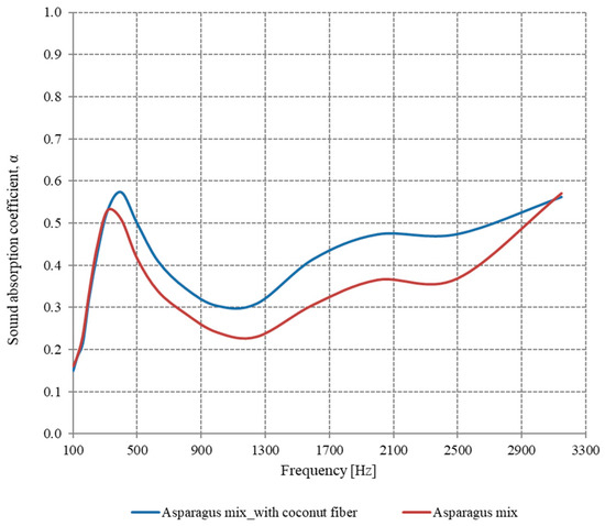 In the case of the Asparagus mix plant, it is observed in Figure 9 that the values of the sound absorption coefficient are increased over the entire range of frequencies analyzed when the coconut fiber is used.