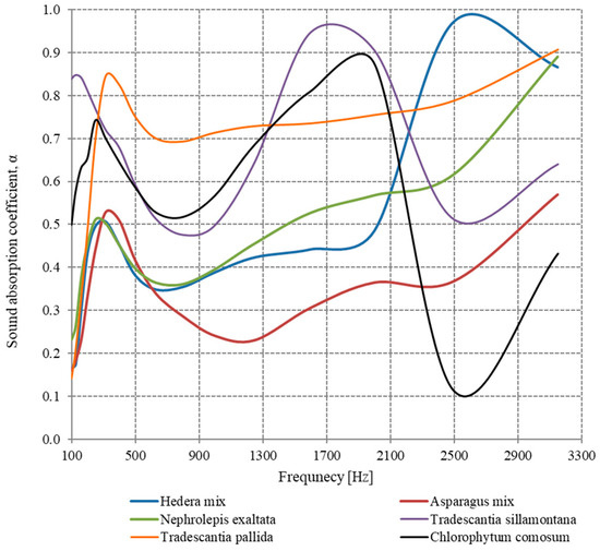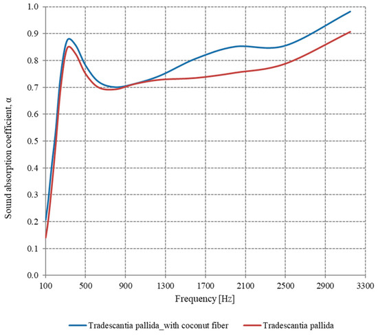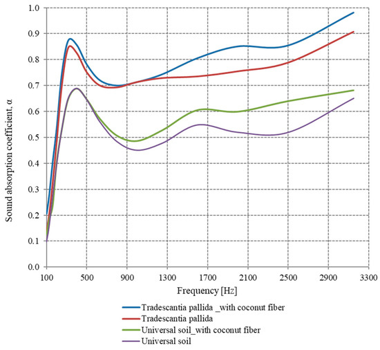 The Tradescantia pallida plant has the highest values of the sound absorption coefficient over the widest range of frequencies, both when the coconut fiber layer is installed over the soil, but also when this layer is missing. For both situations, the value of the sound absorption coefficient exceeds the value of 0.7 in the frequency range 250–3150 Hz, which gives us the certainty that this plant can be used in green acoustic panel development.