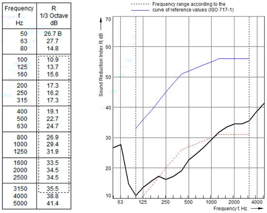 According to the measurement procedure stipulated in SR EN ISO EN ISO 10140-2;5:2021 [26], the resulting values of the sound reduction index curve, in frequencies range of 50 to 5000 Hz, are presented in Figure 18.
