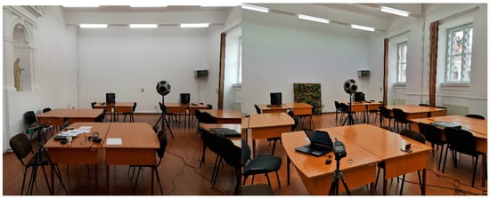 The acoustic measurements were performed in the unoccupied room, using two source positions (S1—in the center of the room and S2—between the working groups). The distances between the microphone positions were chosen to be at least 2 m and the distances between the microphone to the delimiting surfaces were chosen to be at least 1 m [28].