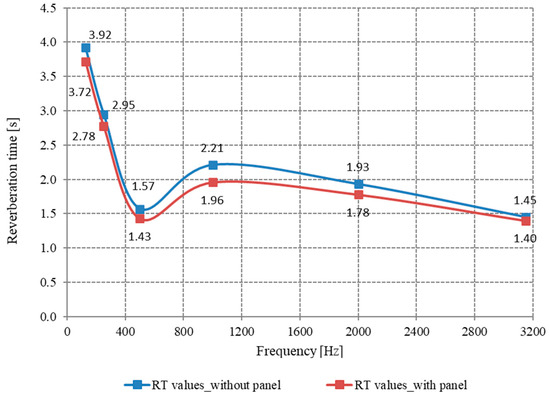 Based on the registered results, it was found that reductions in the reverberation time values were achieved in the presence of the studied green acoustic panel (Figure 20). A decrease in the reverberation time values was observed, although the surface of the green dividing panel was only 1.875 m2 out of a total of 320 m2, considering the area of the delimiting surfaces of the studied space.