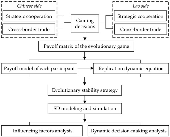 The primary focus of this study is to promote China–Laos power cooperation by understanding the strategic behaviors of both parties. This study first establishes an evolutionary game model to analyze the factors influencing the choice and stability of power cooperation strategies between China and Laos; subsequently, a simulation using Vensim PLE is conducted to illustrate the internal evolution mechanism, and a sensitivity analysis is performed to identify the critical factors affecting strategy selection and cooperation benefits. The introduction to the whole modeling and simulation process regarding the research methodology is depicted in Figure 1. Finally, based on the research findings, some recommendations are proposed to promote China–Laos power cooperation.