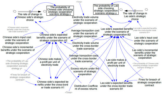 Although the evolutionary game model can elucidate the process and equilibrium state of a game, it has limitations in illustrating the dynamic decision-making process of the game participants. To address this, our study constructs a dynamic model of a China–Laos power cooperation by integrating evolutionary game analysis with system dynamics (SD) theory. Through simulation, we provide a more intuitive representation of the dynamic changes in strategic choices made by both parties. As an effective tool for studying the behavioral characteristics and feedback mechanisms of a system, SD is particularly suitable for cross-border power cooperation because the decision-making behaviors of the involved parties influence each other. Each party observes and learns from the other’s gains, adjusting its decision-making strategy accordingly. Based on this approach, we developed a corresponding SD model using Vensim PLE software to simulate and analyze the dynamic behavior of this complex system (as shown in Figure 3).