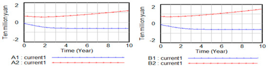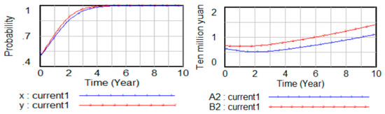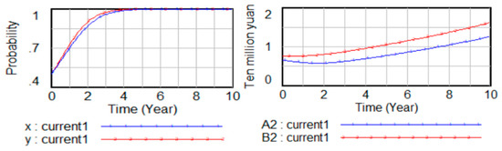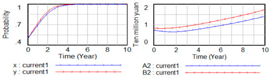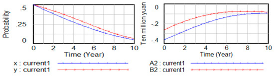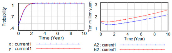 This study utilizes the average transaction volume of the China–Laos electricity trade from 2015 to 2020 as a basis, setting the transaction volume for the cross-border trade scenario at 9.675. Based on the analysis of Laos’ power resource potential, technical potential, and market potential, KHAMSONE (2020) estimated that Laos’ future power export growth rate will be 8% per year [59]. This study is based on the electricity trade volume in 2020 and assumes that the bilateral trade volume increases by 8% each year from 2020 to 2030 as strategic cooperation scenario trade volume . Reasonably set the excess return in 2020 to 1, with an annual growth rate of 5% (based on China’s economic growth rate). Set other parameters based on reality analysis and references [60], [60], [61], [61], , , , , , . Among them, the unit of electricity trade volume is 10 million kWh, the unit of power trade profit and cost is yuan/kWh, and the unit of cost and benefit is 10 million in every year for the next 10 years. We assume that the model start time is INITIAL TIME = 0, end time is FINAL TIME = 10, representing ten years; step size TIME STEP = 0.083, representing January, in line with the actual situation of monthly power transactions. In addition, the initial probabilities and of the strategy choices of China and Laos are set to 0.5 before the model is run.
